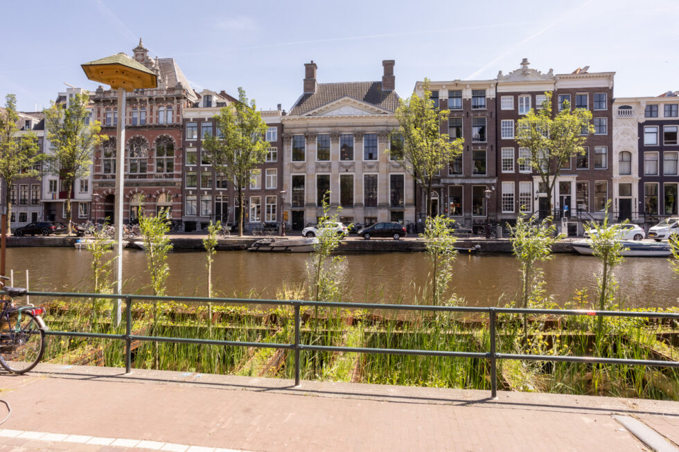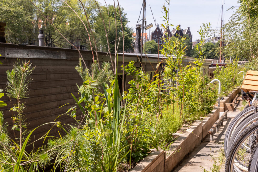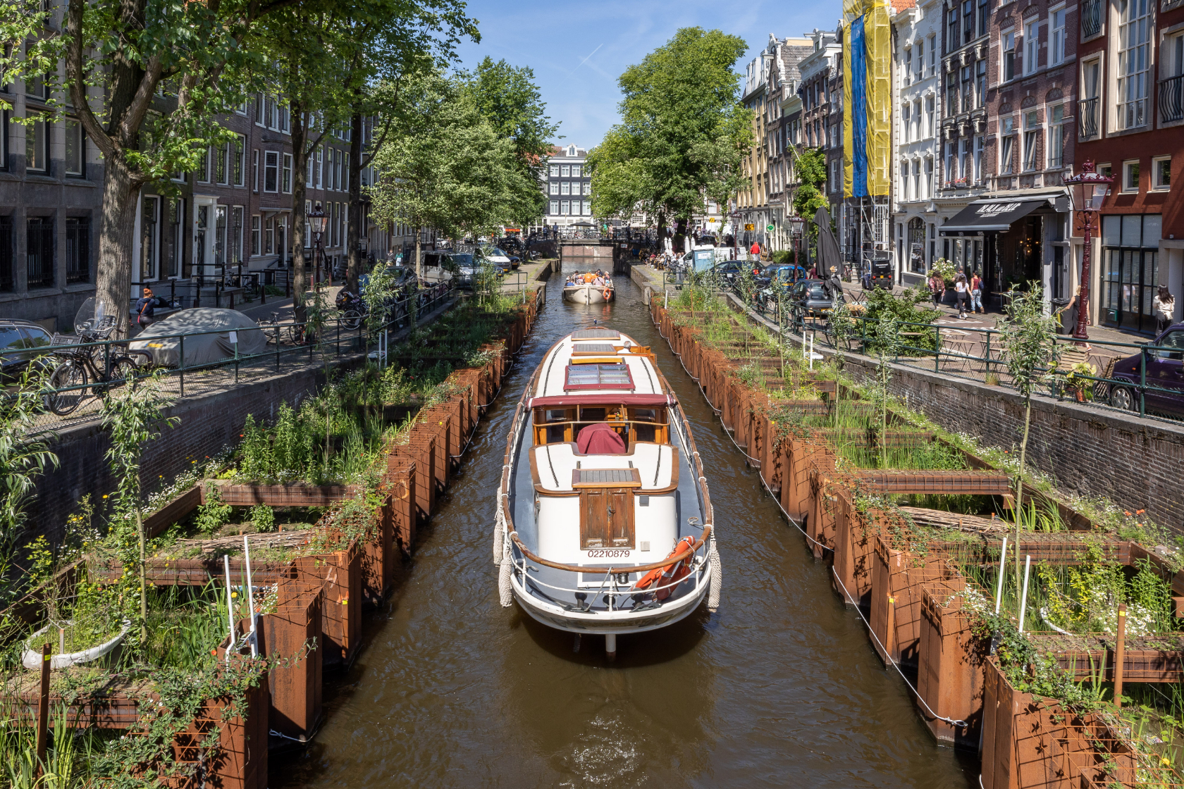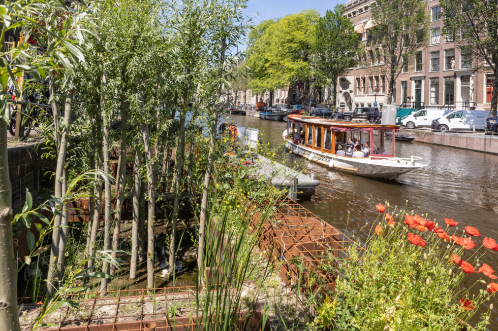 Op de Kloveniersburgwal plaatsten we bijna 400 meter aan damwanden. Die schreeuwden om vergroening. Inmiddels groeien de klimplanten door de roosters heen en steken de wilgentenen en lisdodde boven de damwanden uit.