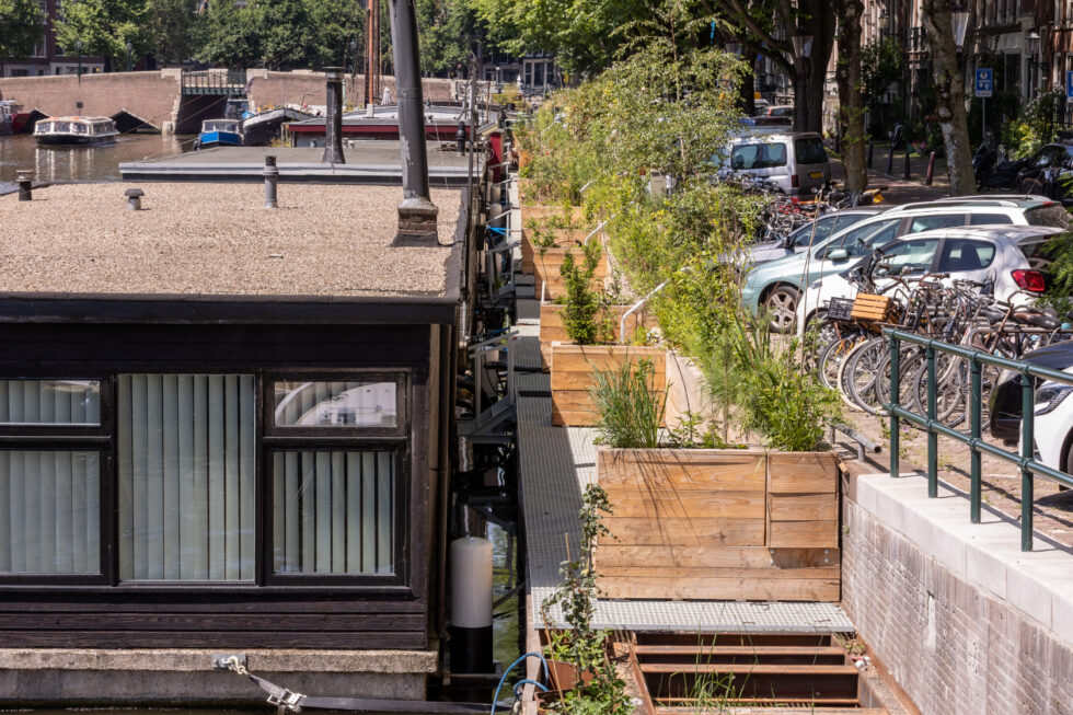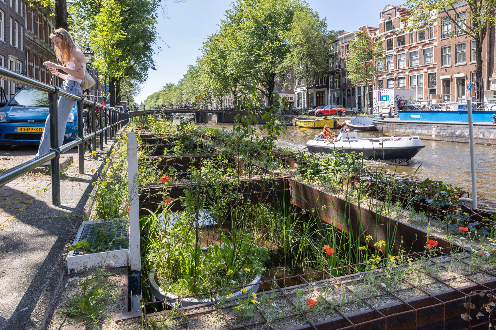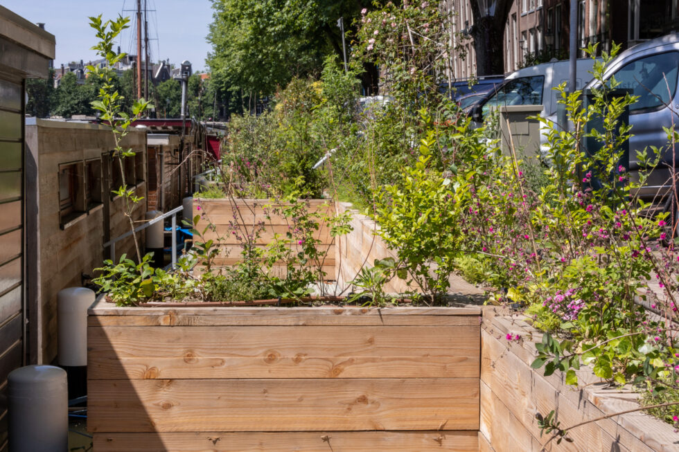 Op de veiligheidsconstructie bij de Binnenkant langs de Waalseilandsgracht staan 82 plantenbakken. Via een automatisch systeem met druppelleidingen krijgen de planten de juiste hoeveelheid water.