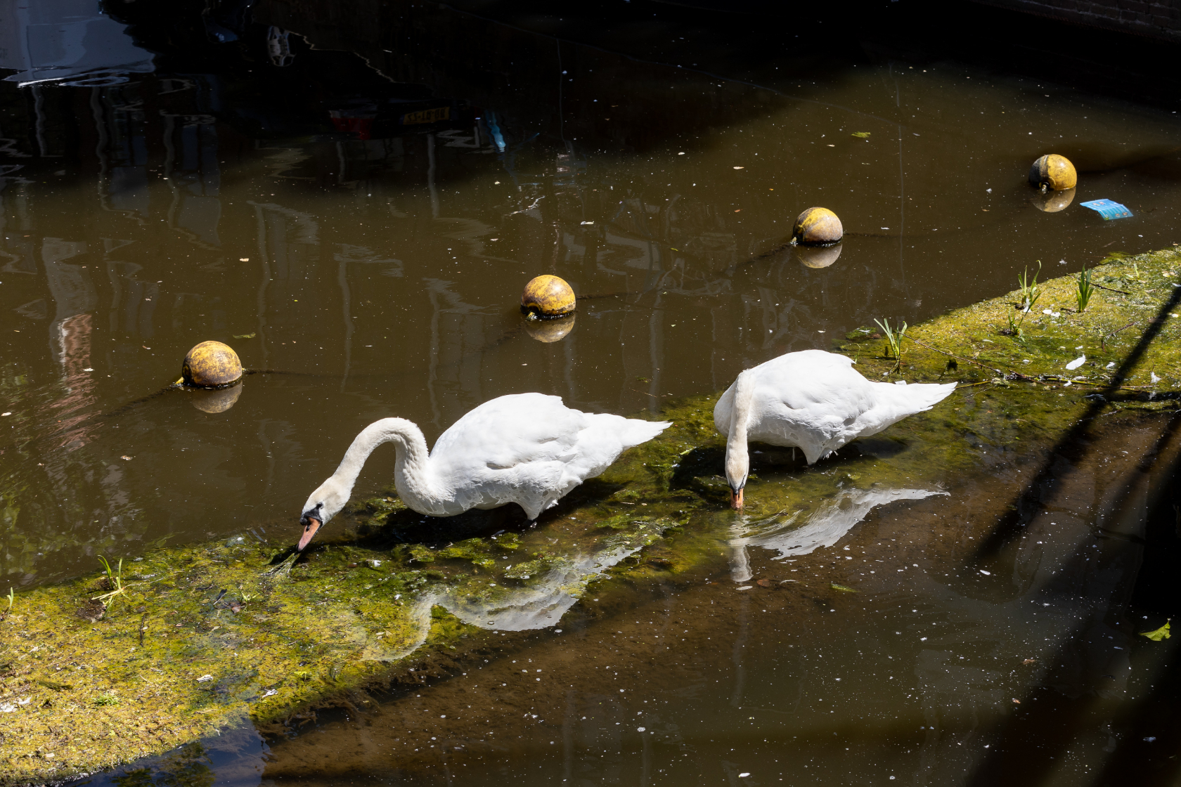Bij de Staalmeestersbrug is het wat minder groen. De klimplanten groeien goed. Maar naast de brug zitten de zwanen, eenden, meerkoeten en duiven graag op de drijftuinen. Ze eten de moerasplanten, maar trappen ze ook plat. De planten kunnen daardoor niet goed groeien. Binnenkort worden er nieuwe plantjes ingezet en krijgen de drijftuinen een tweede kans.